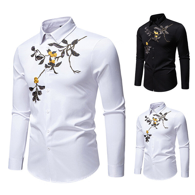 Herren elegantes Langarmhemd mit floraler Stickerei Aliams