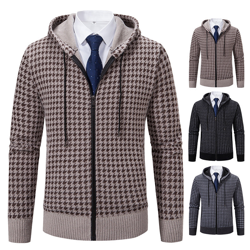 Herren gemütlicher Strickpullover mit modernem Karomuster und Kapuze Aliams