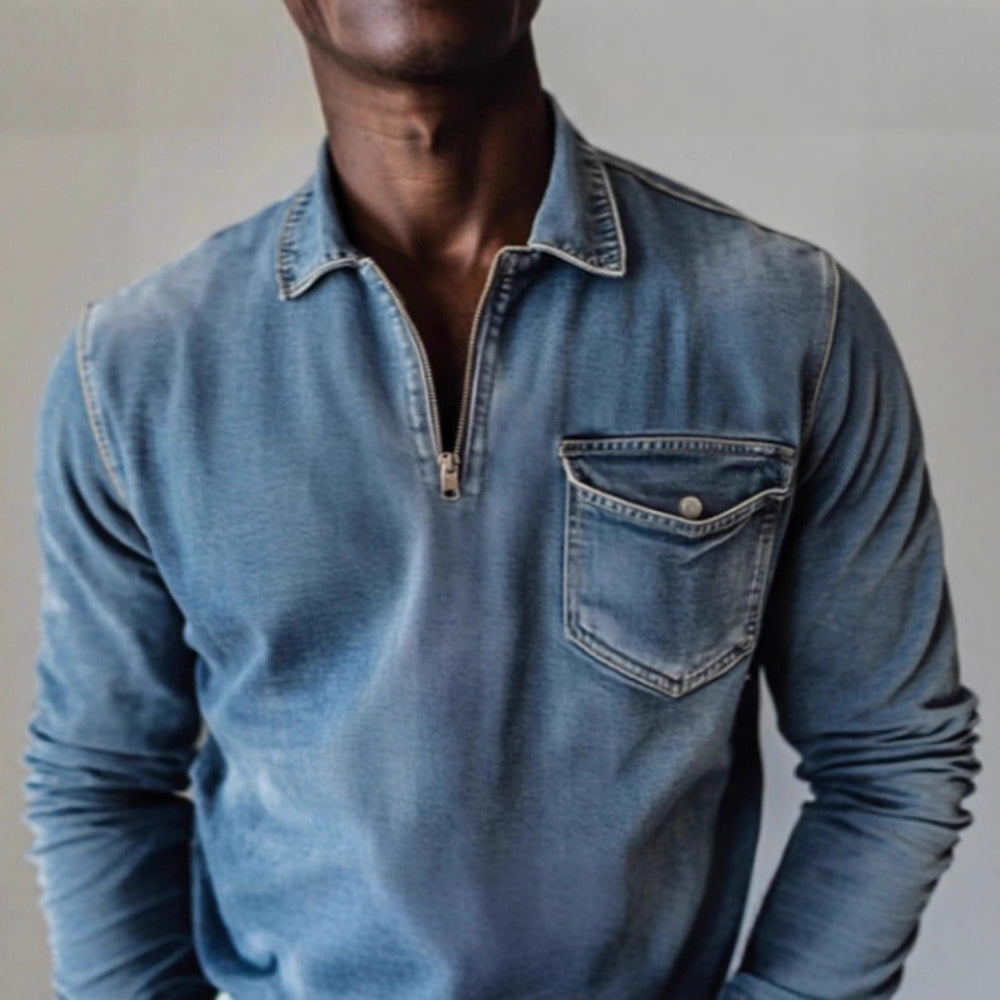 Herren Jeanshemd mit kurzem Reißverschluss und Brusttasche Aliams