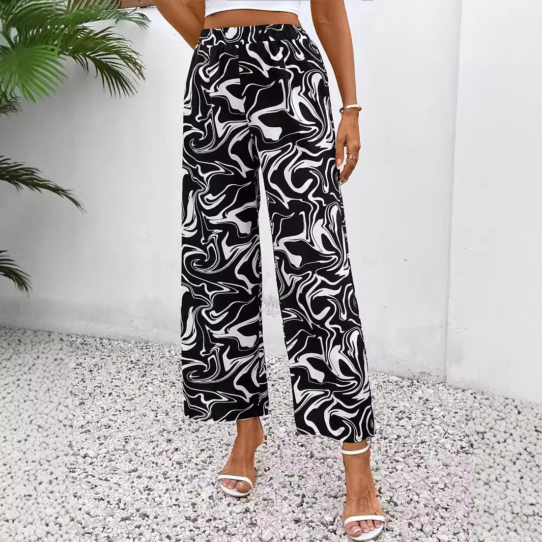 Damen Weite Palazzo-Hose mit Modernem Marmorprint und Elastischem Bund Aliams