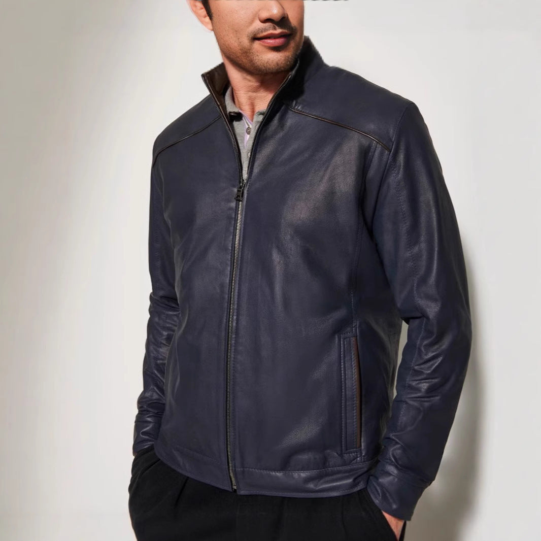 Herren stylische Lederjacke mit modernem Stehkragen und dezenten Kontrastnähten Aliams