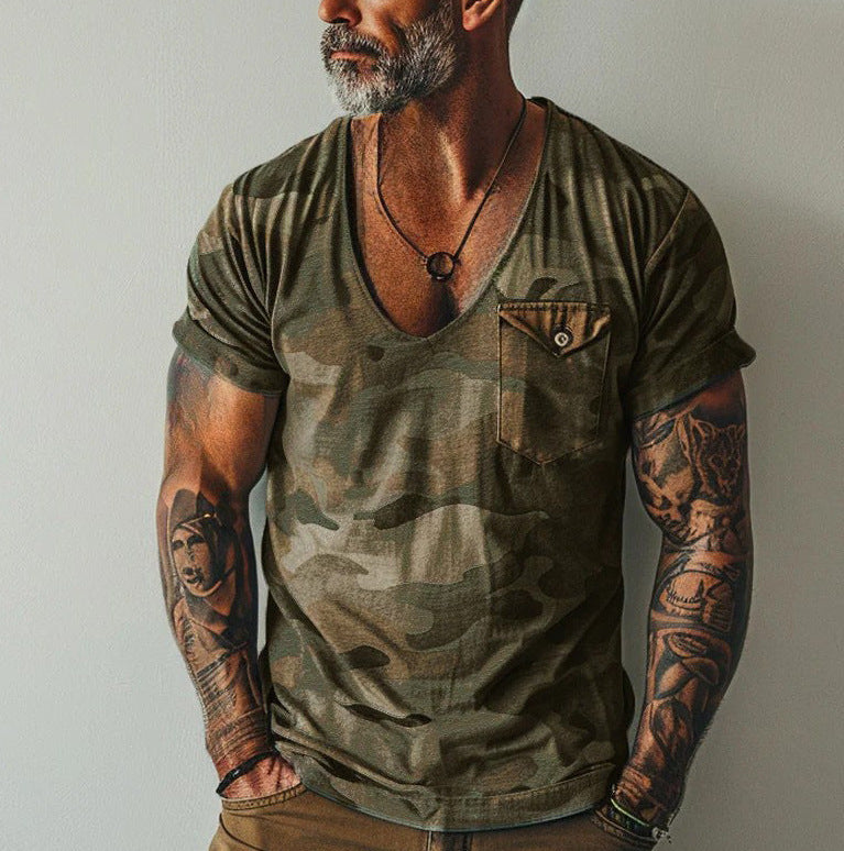 Herren V-Ausschnitt T-Shirt mit Brusttasche und modernem Camouflage-Muster Aliams