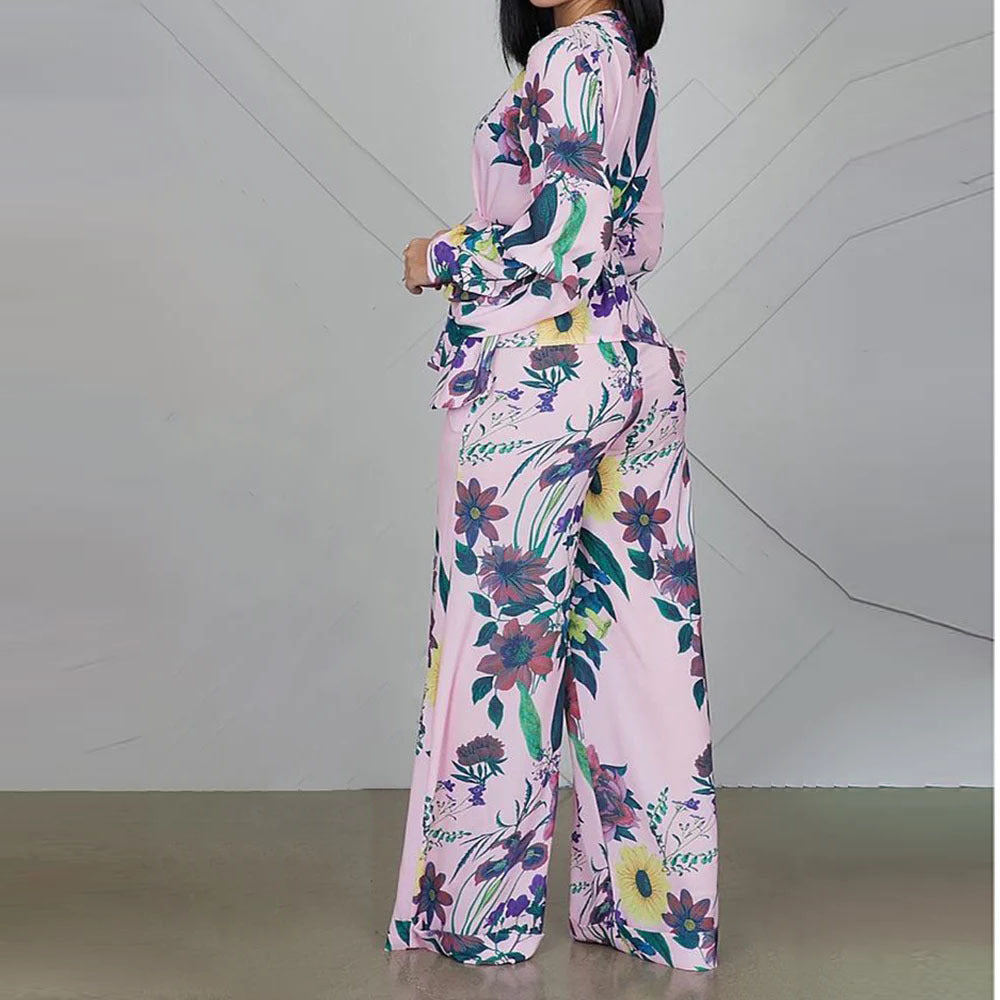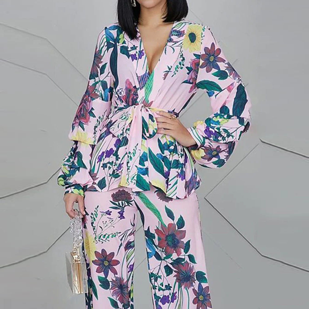 Damen Blütenmuster Zweiteiler mit weitem Bein und Bindegürtel Aliams