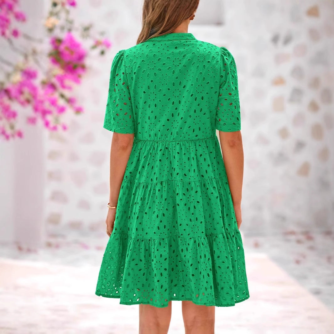 Entdecken Sie unser Damen luftiges Midikleid mit romantischem Lochmuster und V-Ausschnitt Aliams, das perfekt für warme Sommertage und festliche Anlässe geeignet ist. Dieses Kleid vereint Eleganz und Bequemlichkeit und lässt sich leicht kombinieren.