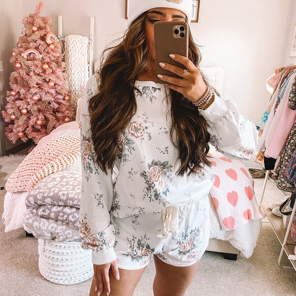 Entdecken Sie unser Damen Schlafanzug-Set mit einem charmanten floralem Design, ideal für entspannte Nächte oder gemütliche Tage zu Hause. Dieses Set besteht aus einem langärmligen Oberteil und Shorts, die sowohl Komfort als auch Stil bieten.