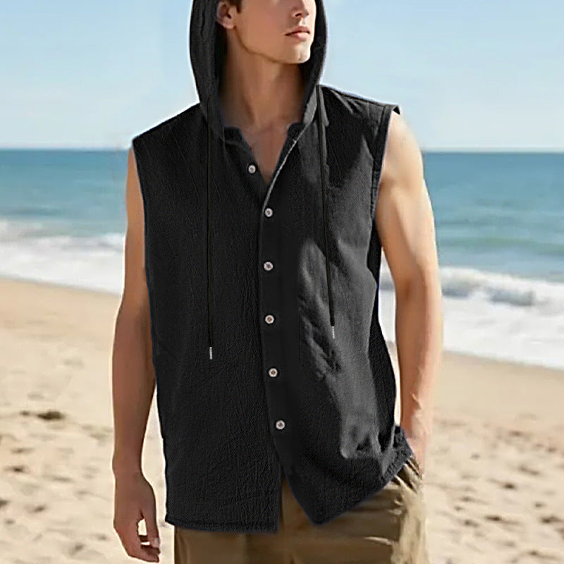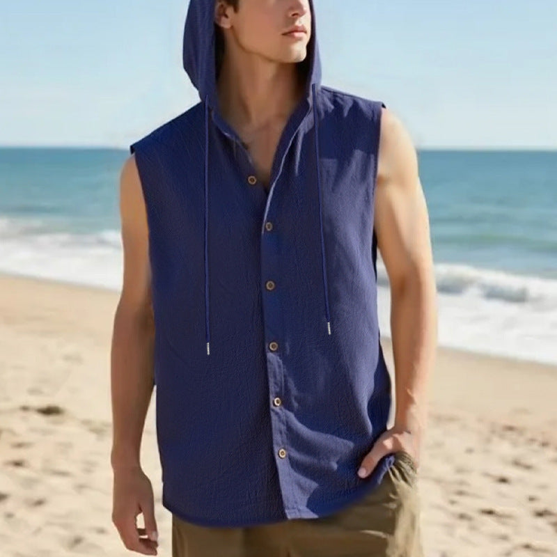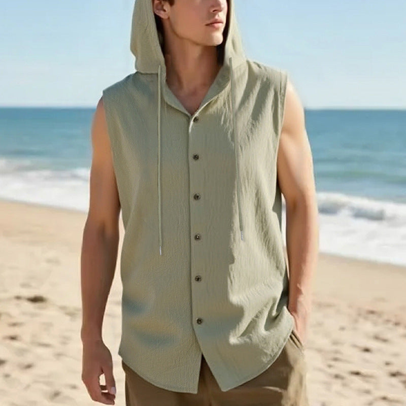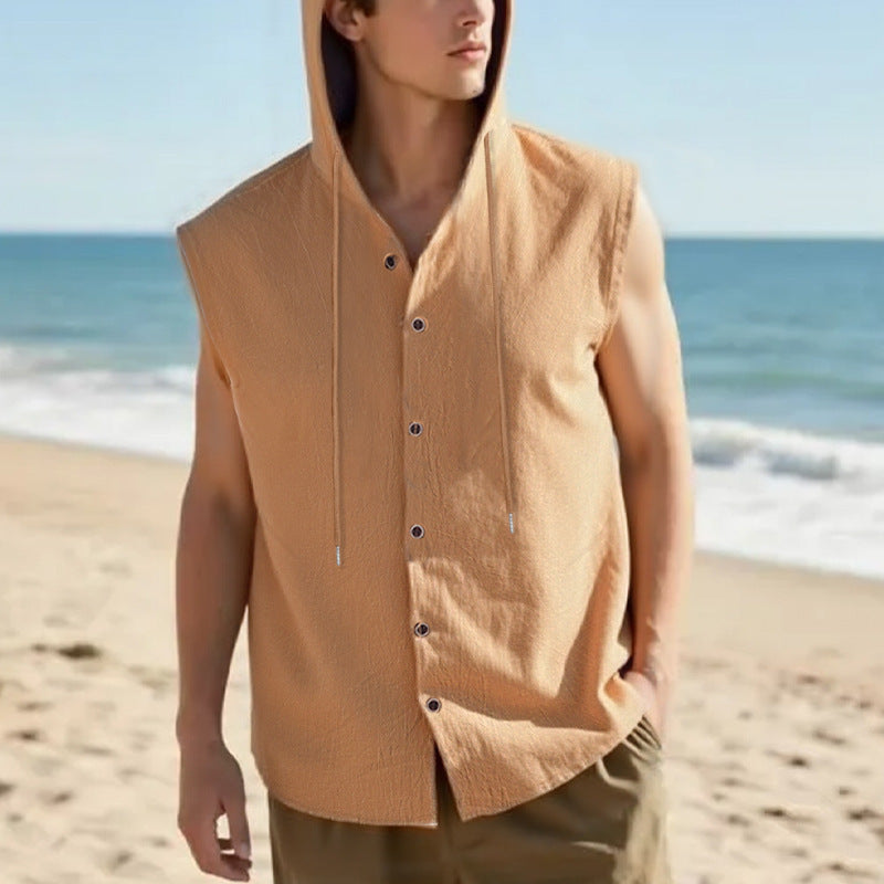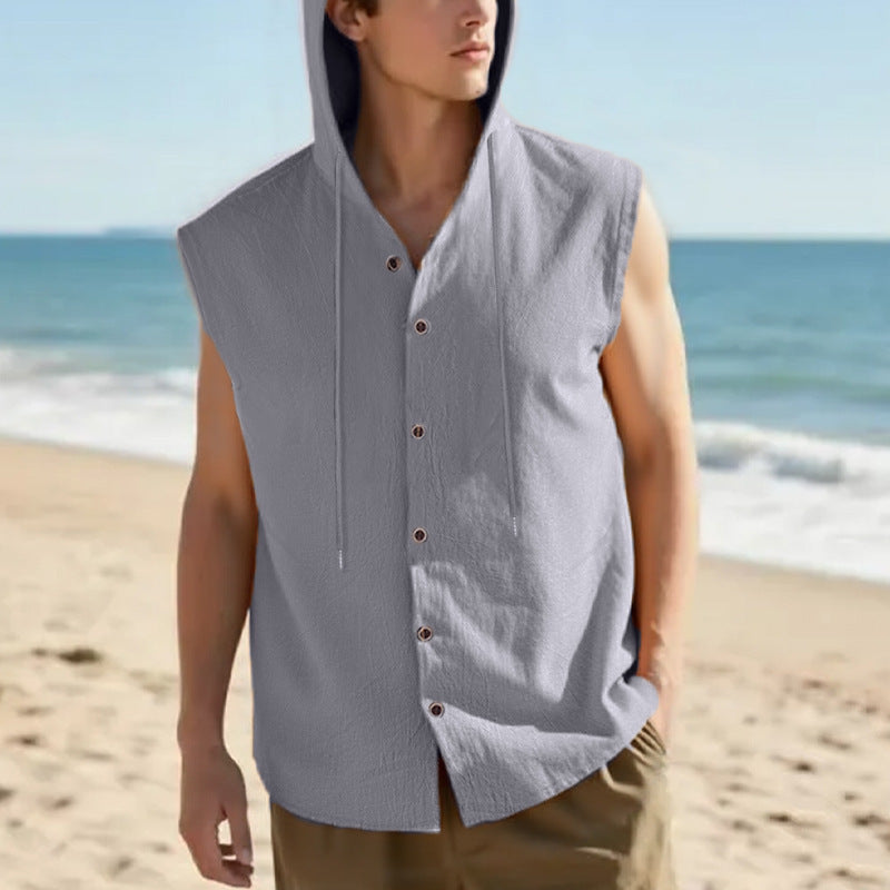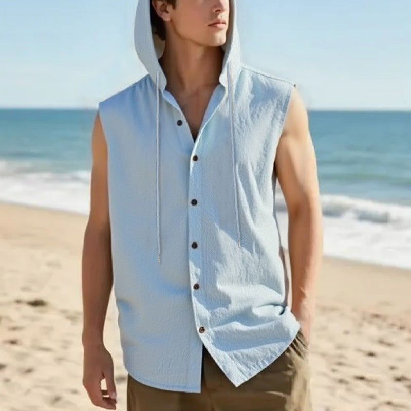 Entdecken Sie unser Herren ärmelloses Kapuzenshirt mit Knopfleiste und lässigem Schnitt, ideal für warme Tage am Strand oder in der Stadt. Dieses vielseitige Shirt kombiniert Komfort und Stil und bietet Ihnen die perfekte Lösung für Ihre sommerlichen Aktivitäten.