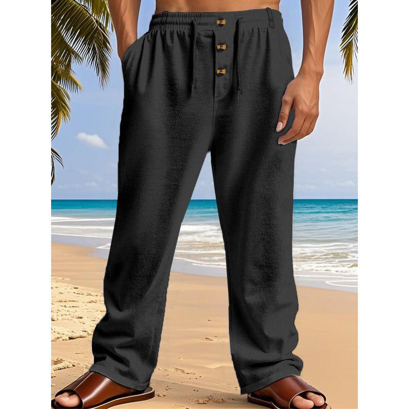 Die Hose verfügt über moderne Knopfdetails, die einen lässigen, aber zugleich eleganten Look verleihen. Der weiche und atmungsaktive Stoff sorgt dafür, dass Sie sich an heißen Tagen wohlfühlen, während die lockere Passform Bewegungsfreiheit bietet.