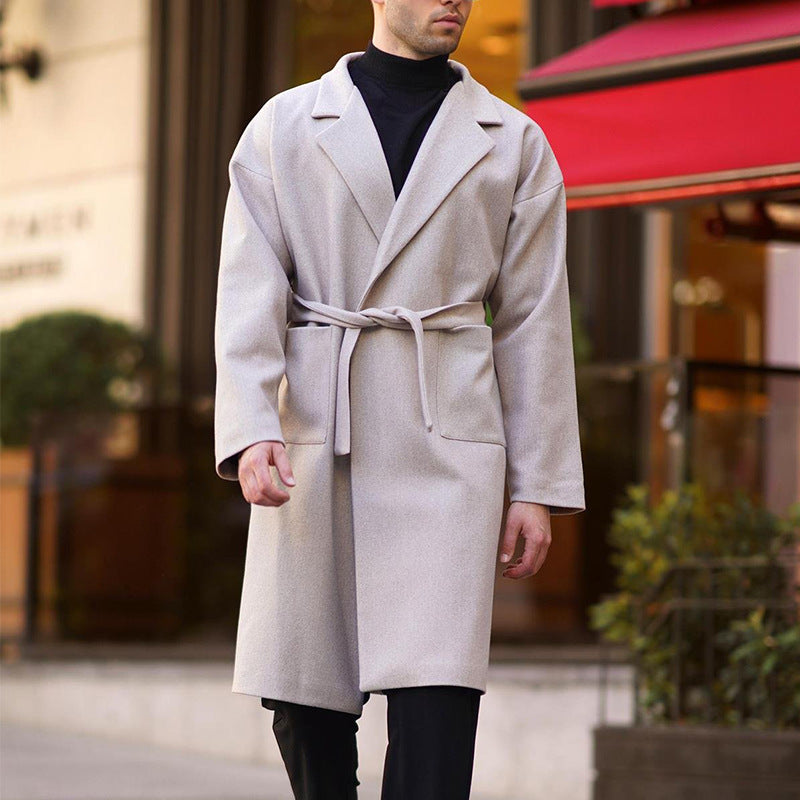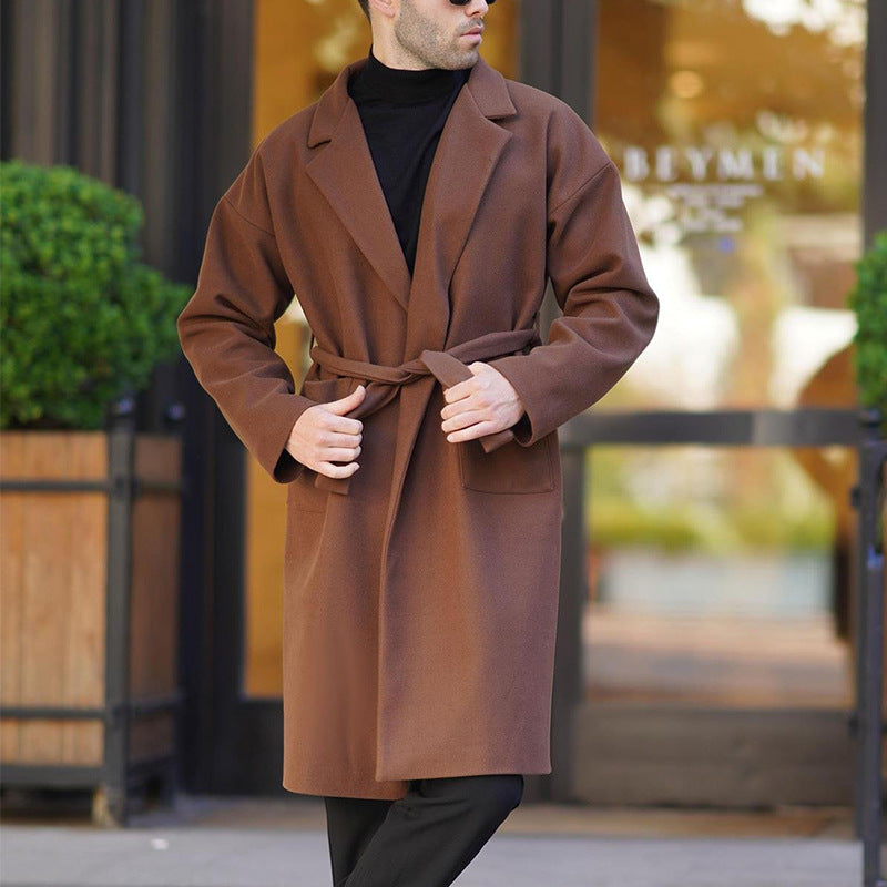 Herren eleganter Wollmantel mit Gürtel und tiefem Kragen Aliams