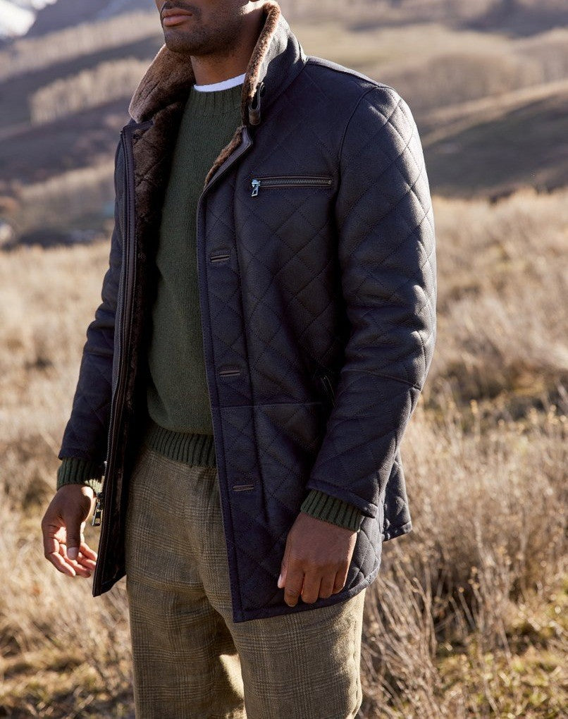 Entdecken Sie den perfekten Begleiter für die kälteren Monate mit unserem Herren gesteppter Kunstleder-Mantel mit Teddyfell-Kragen von Aliams. Dieser elegante Mantel kombiniert stilvolles Design mit erstklassigem Komfort und Wärme.