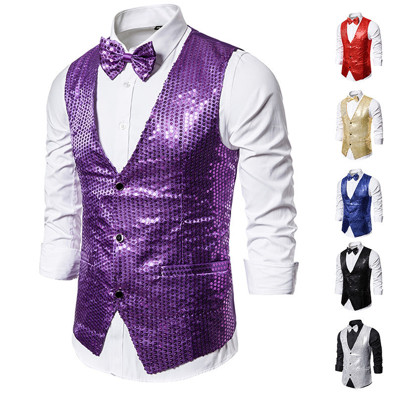 Entdecken Sie die Herren Glänzende Pailletten-Weste mit passendem Fliegen von Aliams - der perfekte Begleiter für festliche Anlässe und besondere Veranstaltungen. Diese elegante Weste kombiniert stilvollen Glanz mit bequemer Passform und ist ideal für Hochzeiten, Partys und Gala-Abende.