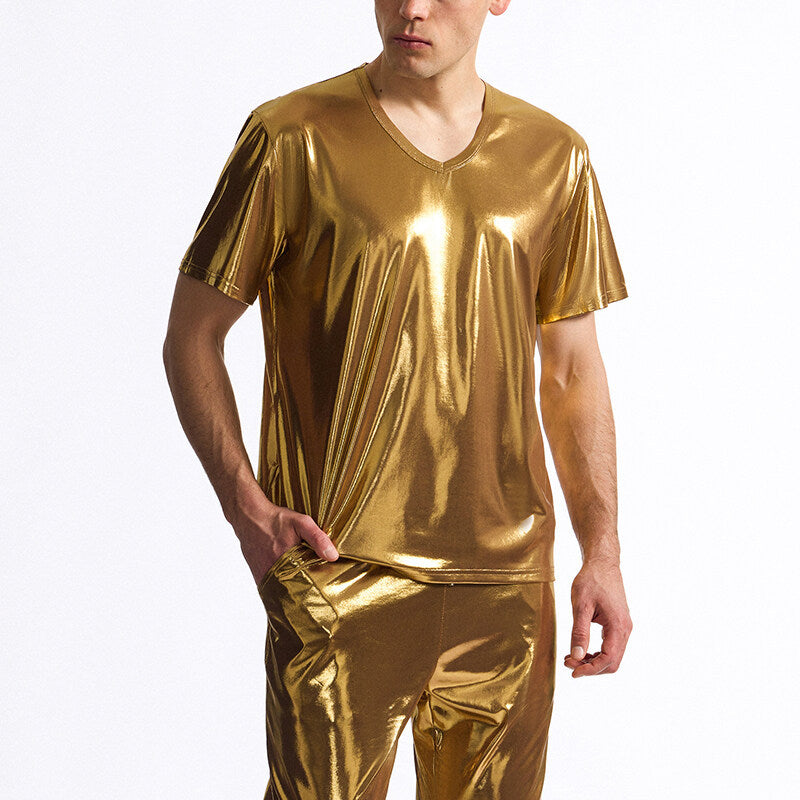 • Design: Der V-Ausschnitt sorgt für eine elegante Silhouette, während die glänzende Oberfläche das T-Shirt zu einem echten Blickfang macht.