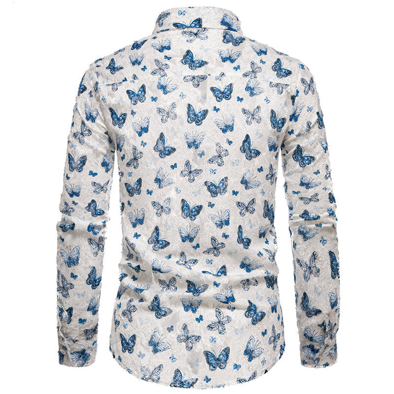Entdecken Sie das Herren Hemd Aliams, ein stilvolles und elegantes Kleidungsstück, das ideal für verschiedene Anlässe ist. Dieses schicke Hemd zeichnet sich durch einen einzigartigen Schmetterlingsdruck in verschiedenen Blau- und Weißtönen aus, der jedem Outfit einen frischen, modernen Look verleiht.
