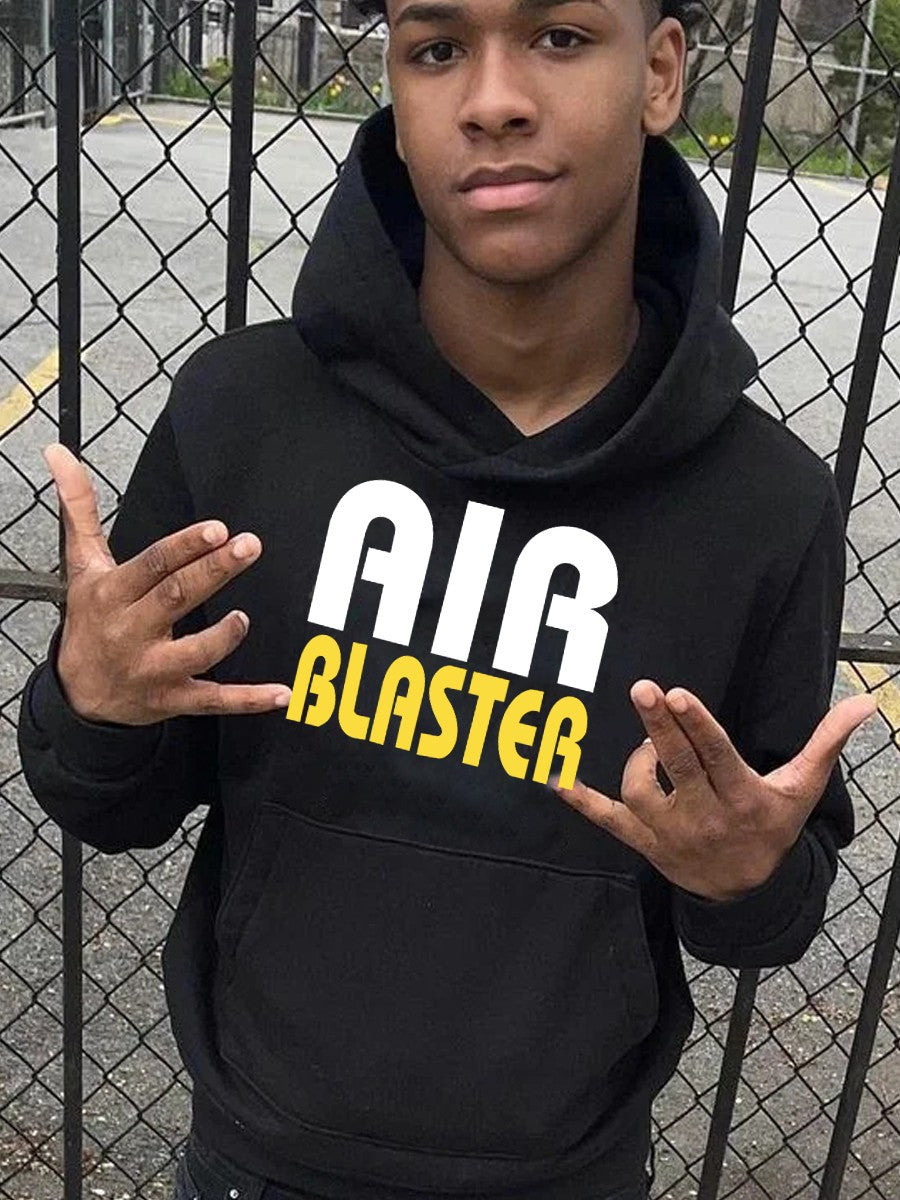 Der Kapuzenpullover kommt in einem klassischen Schwarz und wird durch den markanten "AIR BLASTER" Druck in zauberhaften Kontrasten hervorgehoben. Die praktische Kängurutasche auf der Vorderseite sorgt für zusätzlichen Komfort und Stauraum, während die robuste Kapuze mit Zugband optimalen Schutz bietet.