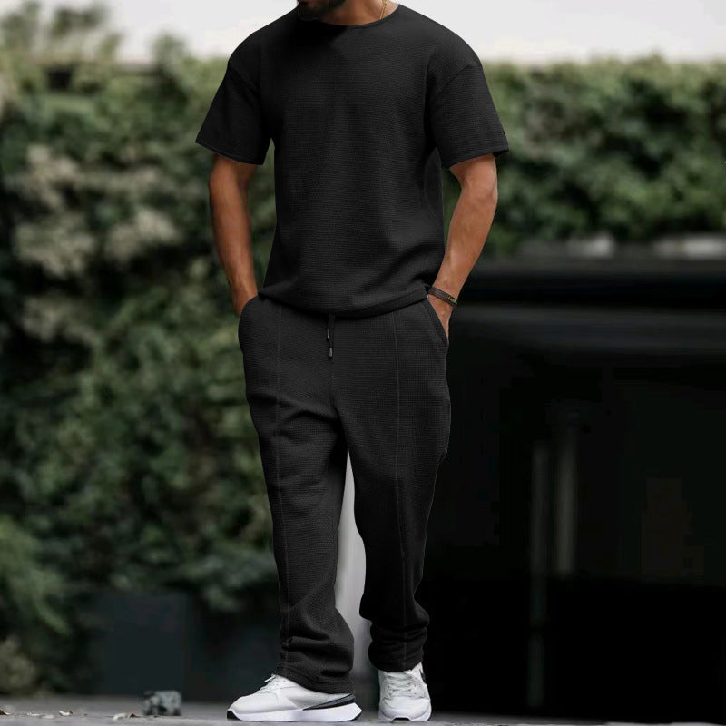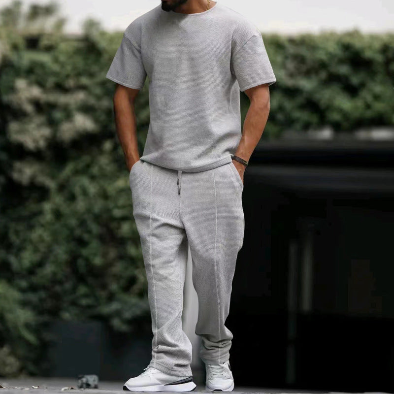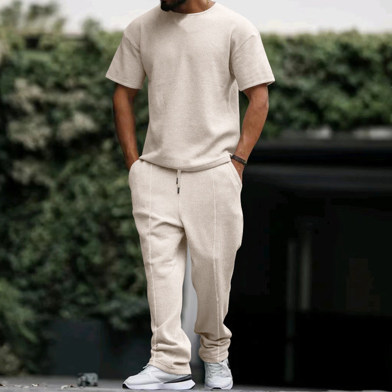 - Modisches Design: Die strukturierte Oberfläche des T-Shirts und die elastische Taille der Jogginghose sorgen für einen modernen, trendbewussten Look.
