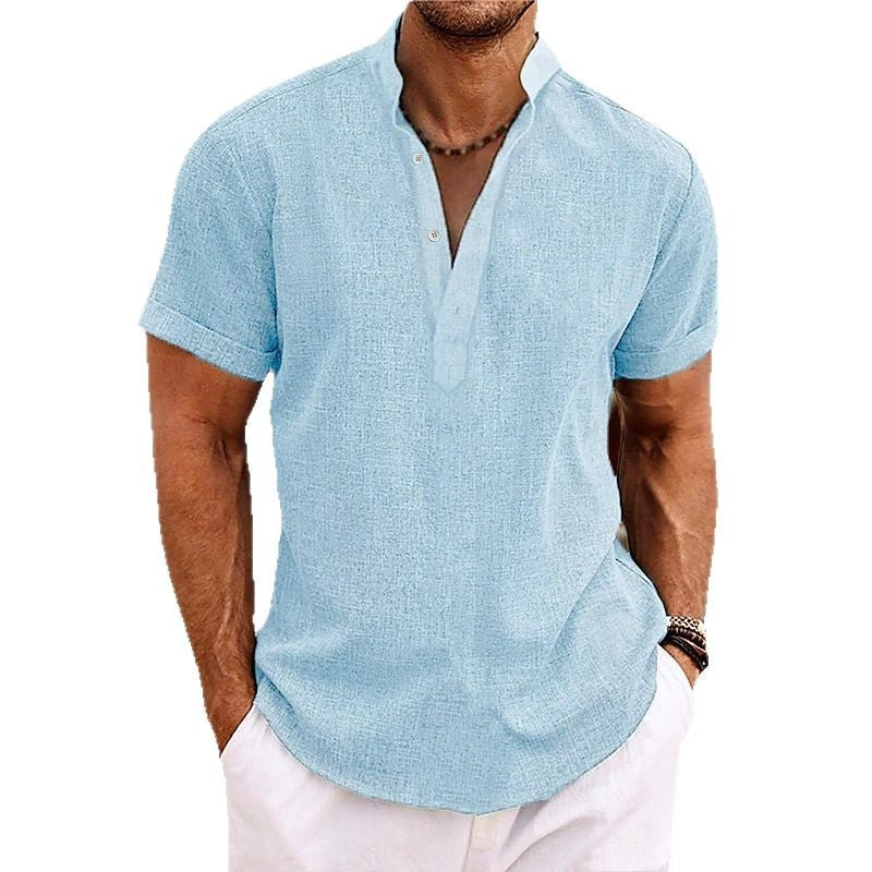 - Stylischer Stehkragen: Der moderne Stehkragen verleiht dem Hemd einen eleganten Look und macht es vielseitig kombinierbar, egal ob zu Shorts oder lässigen Hosen.