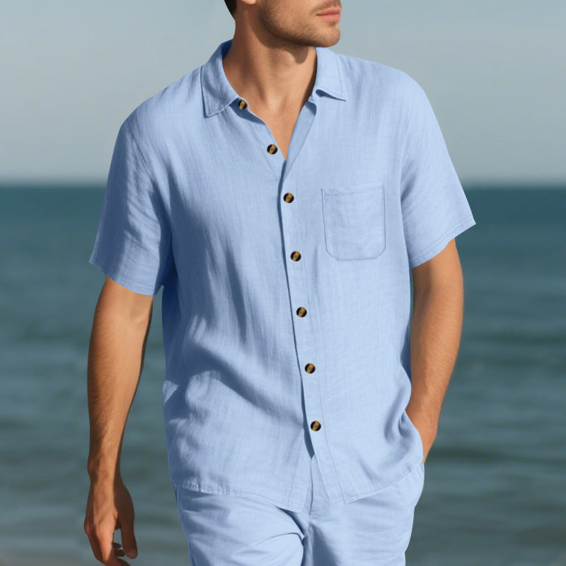 Herren Kurzarm-Leinenhemd mit klassischem Schnitt und Holzknöpfen Aliams