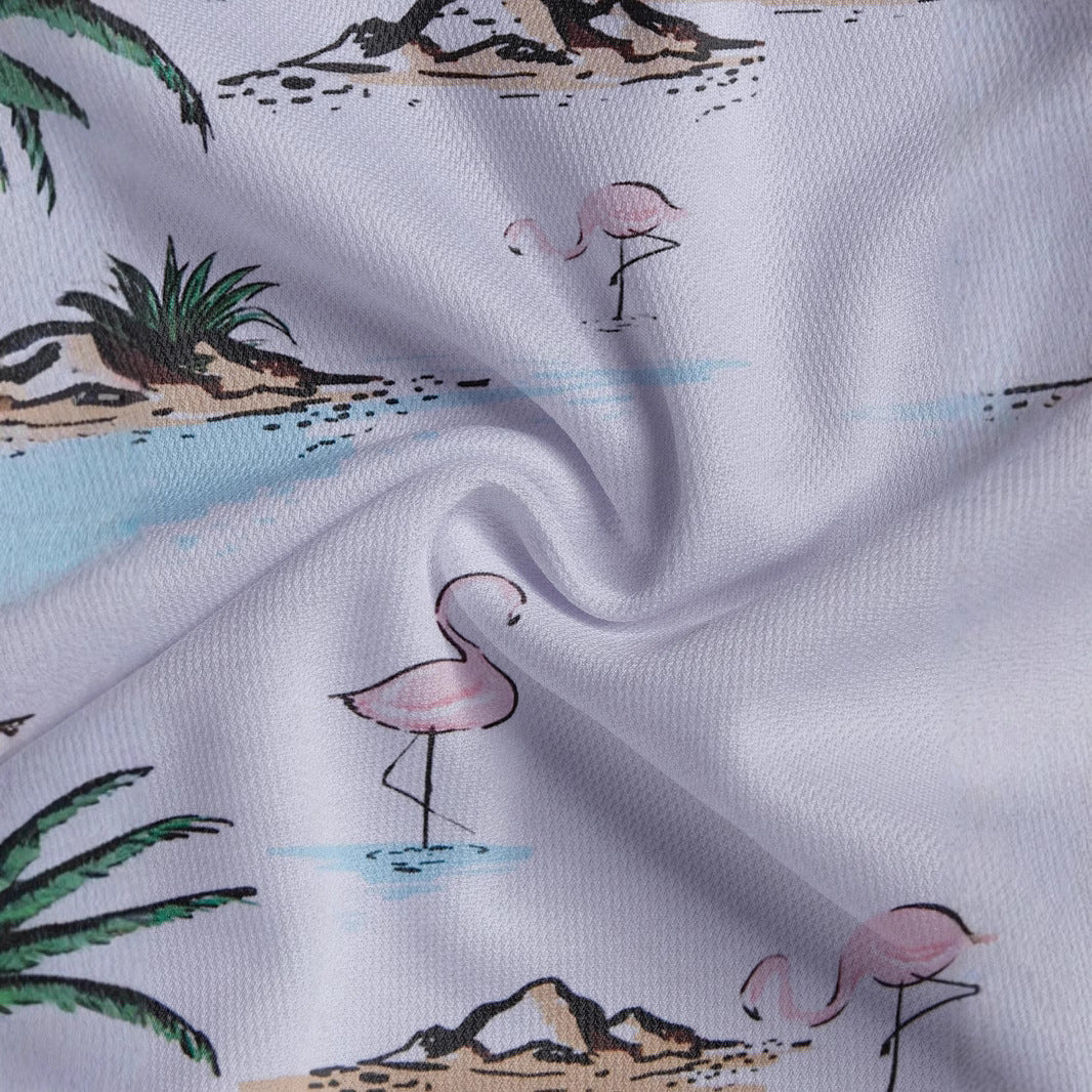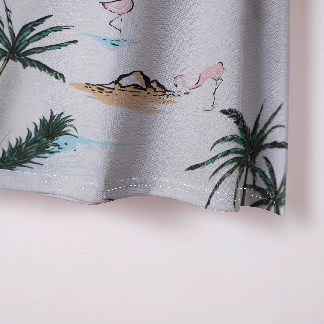 • Design: Auffälliges tropisches Motiv mit Palmen und Flamingos, das jedes Outfit aufwertet.