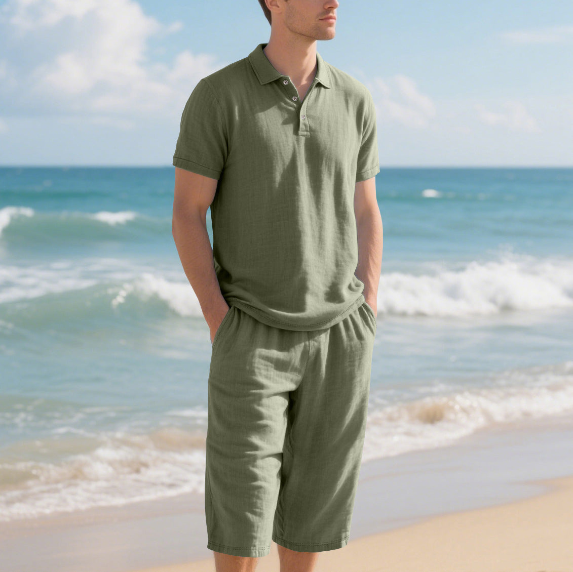 Entdecken Sie das Herren Poloshirt und Shorts Set von Aliams, perfekt für heiße Sommertage am Strand oder entspannte Ausflüge im Freien. Dieses Set vereint Stil und Komfort in einem lässigen, modischen Look.