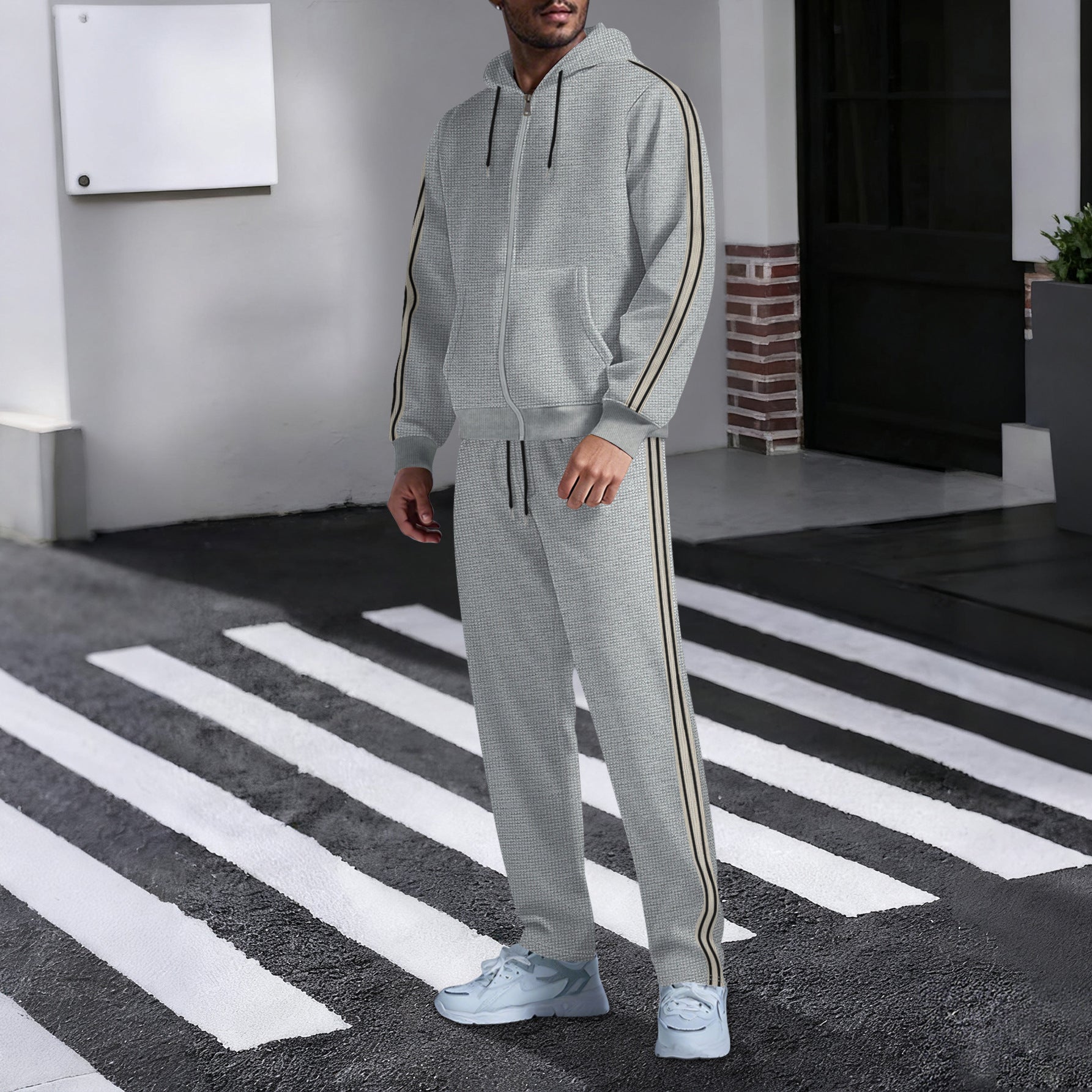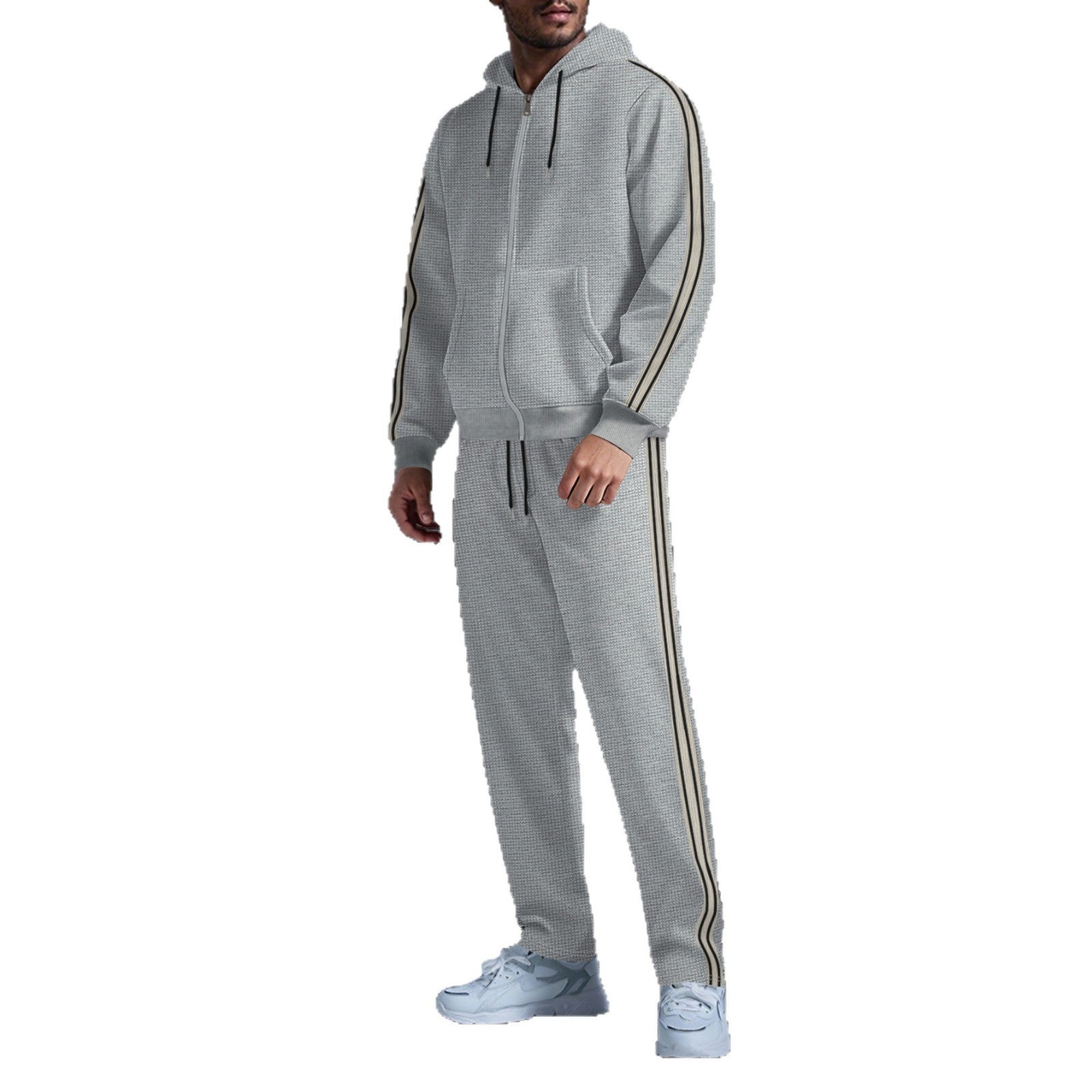 Entdecken Sie unseren Herren sportlichen Kapuzenanzug mit seitlichen Streifen von Aliams, der Komfort und Stil vereint. Dieser Anzug ist perfekt für aktive Männer, die sowohl im Fitnessstudio als auch in der Freizeit gut aussehen möchten.