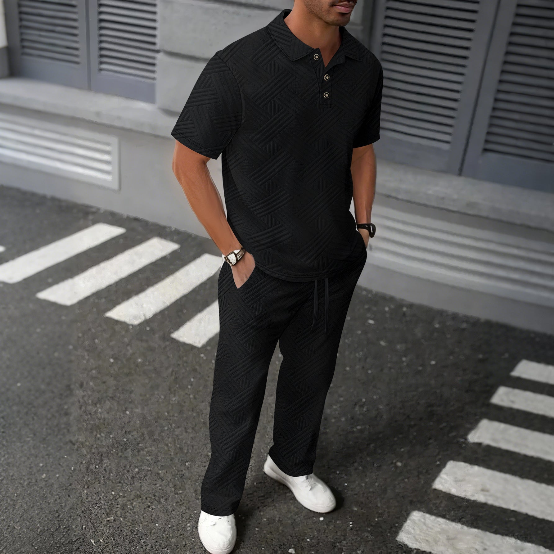Entdecken Sie das perfekte Herren sportliche Freizeit-Outfit von Aliams, das Stil und Komfort vereint. Dieses Outfit besteht aus einem Kurzarm-Polohemd und einer passenden Hose, die beide mit einem modernen und eleganten Muster versehen sind.