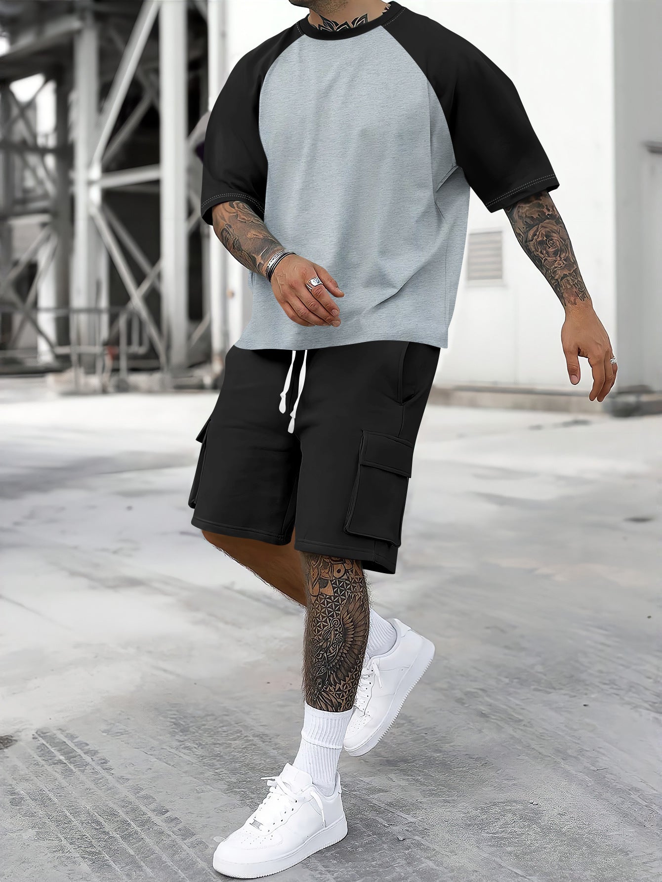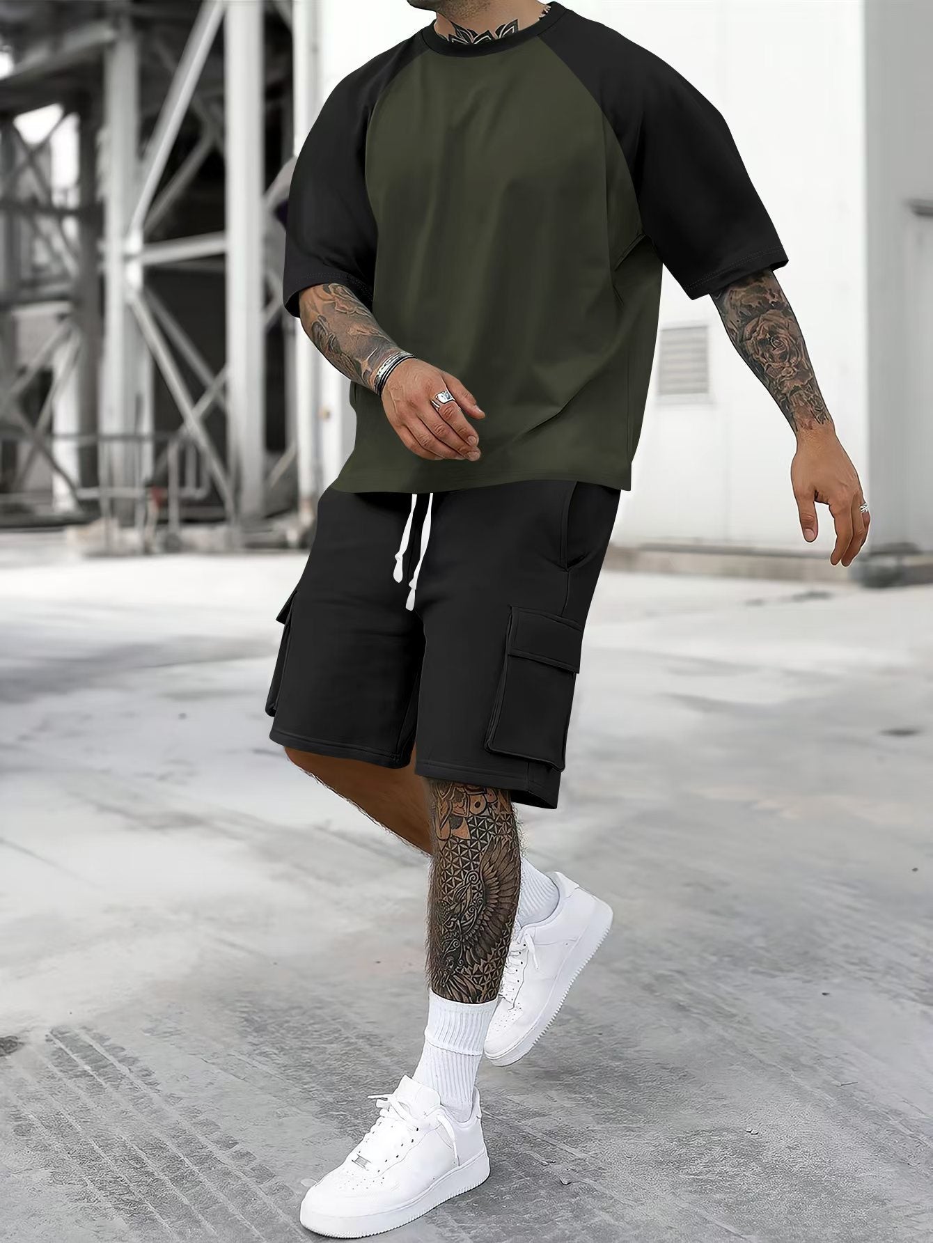 Herren Sportliches T-Shirt und Cargo-Shorts Set mit Kontrastärmel und praktischen Taschen Aliams