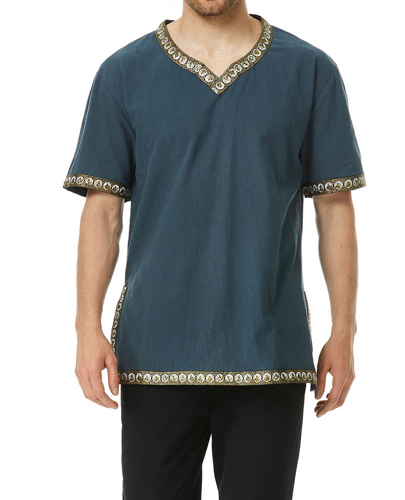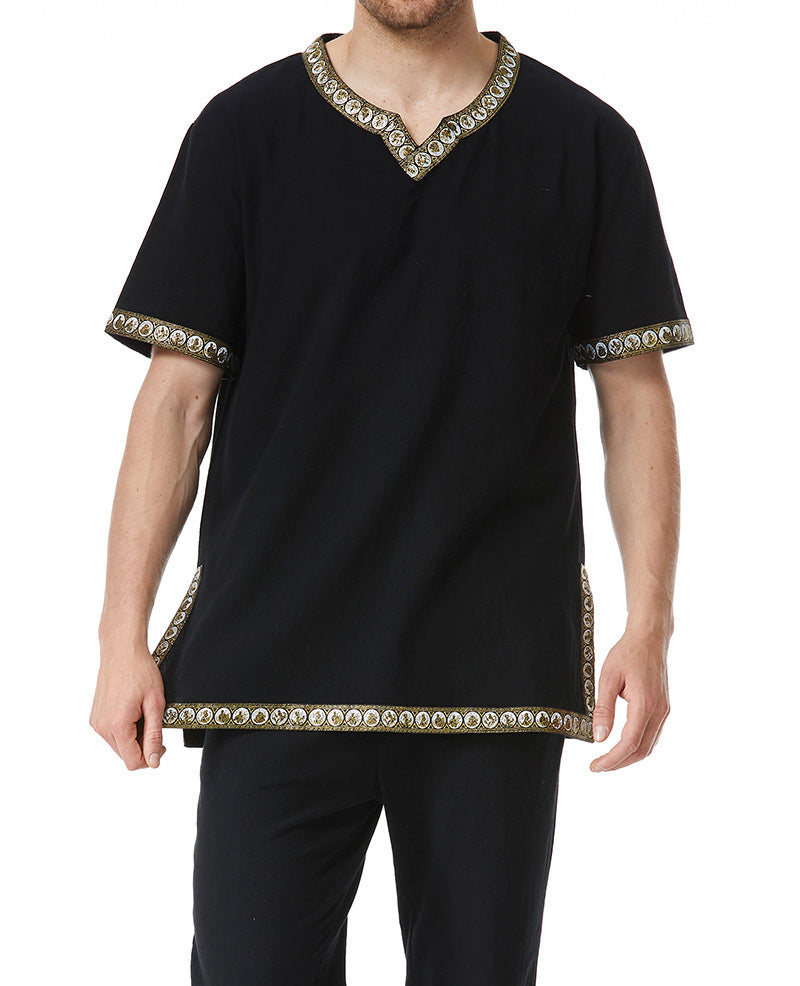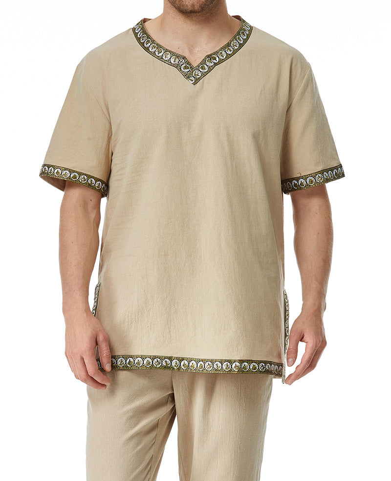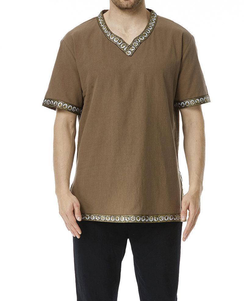 Diese stilvolle Herren Tunika überzeugt durch ihr modernes Design und die sorgfältigen Details. Der dekorative V-Ausschnitt verleiht der Tunika einen besonderen Akzent, während der exquisite Mustersaum für einen eleganten Look sorgt.