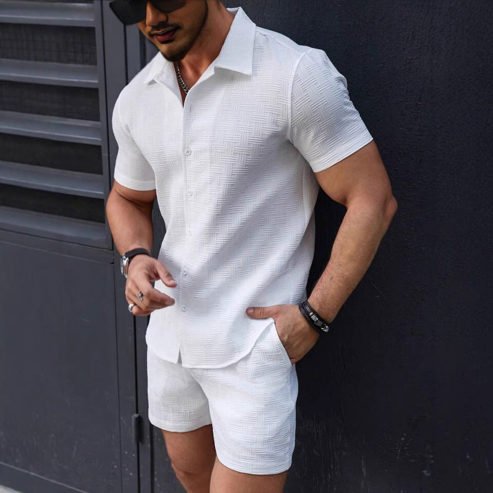 Fügen Sie dieses stilvolle Herren-Texturierte Kurzarm-Set Ihrer Kollektion hinzu und definieren Sie Ihren lässigen Stil neu. Ideal für Sommerausflüge oder entspannte Wochenenden, ist es ein vielseitiges Stück, das Mode und Funktionalität verbindet.